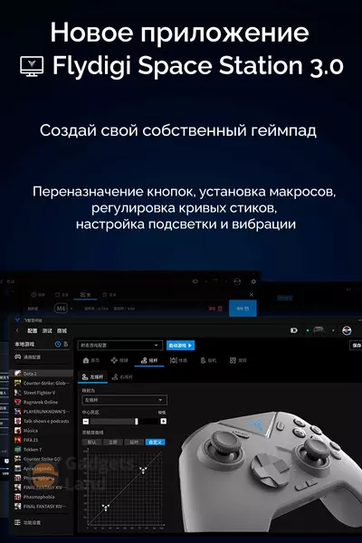 - огромные возможности настройки геймпада с помощью нового фирменного приложения для ПК Flydigi PC Space 3.0 - запись и редактирование макросов, изменение цвета и яркости RGB-подсветки, редактирование кривых стиков, настройка гироскопа;
